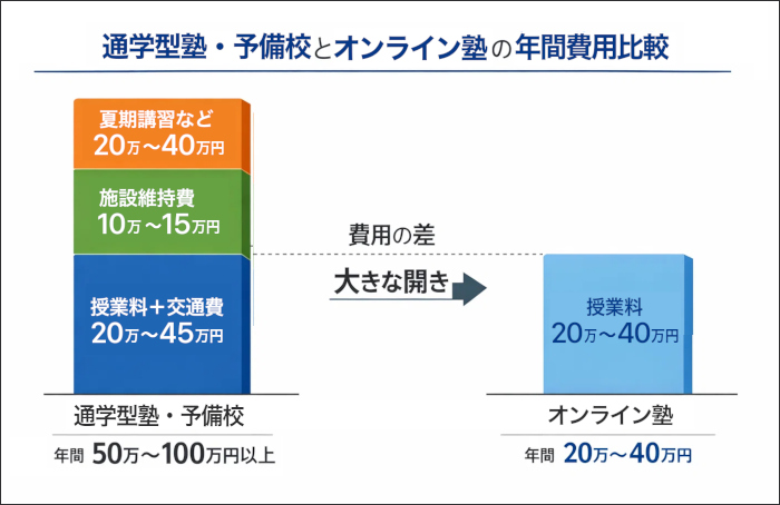 実際に通学型の塾や予備校に通うとなれば、毎月の授業料に加えて、交通費、教室の施設維持費、さらには数十万円単位の夏期講習代などがかさみ、年間で50万〜100万円以上かかることも珍しくありません。